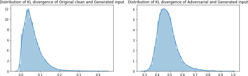 The plots demonstrate that KL divergence between the clean or adversarial input and their generated outputs. The KL divergence between clean and their corresponding generated sample is distributed from 0 to 0.3. Similarly KL divergence between clean and corresponding adversarial sample is distributed from 0.3 to 1.0. This clear distinction between the range of values of KL divergence for clean and adversarial inputs suggest that this method can be used to detect adversarial inputs.