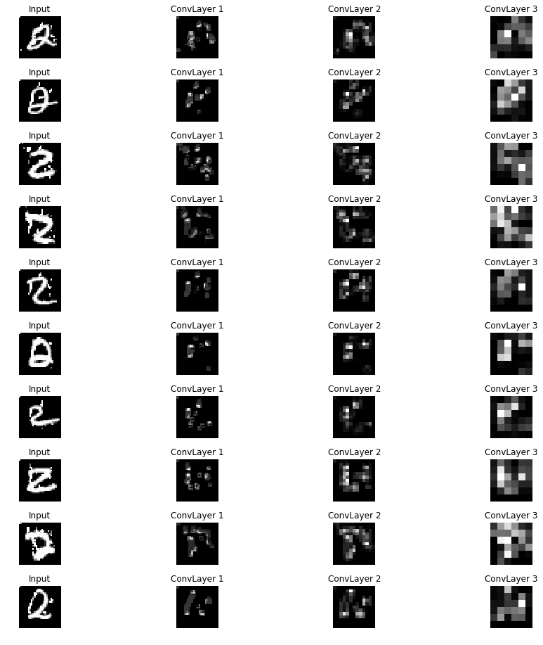 To explore this phenomenon, let's train a purely convolutional network with 3 convolutional layers with filters count 16,32 and 64 respectively. The first layer does not do any spatial downsampling whereas second and third layer downsample with stride length of 2. Cross entropy is used as loss function and Adam is used to update the network parameters.