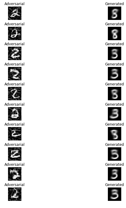 The following are the adversarial inputs and their corresponding generated images by VAE (bottlenect latent dimension is 2.