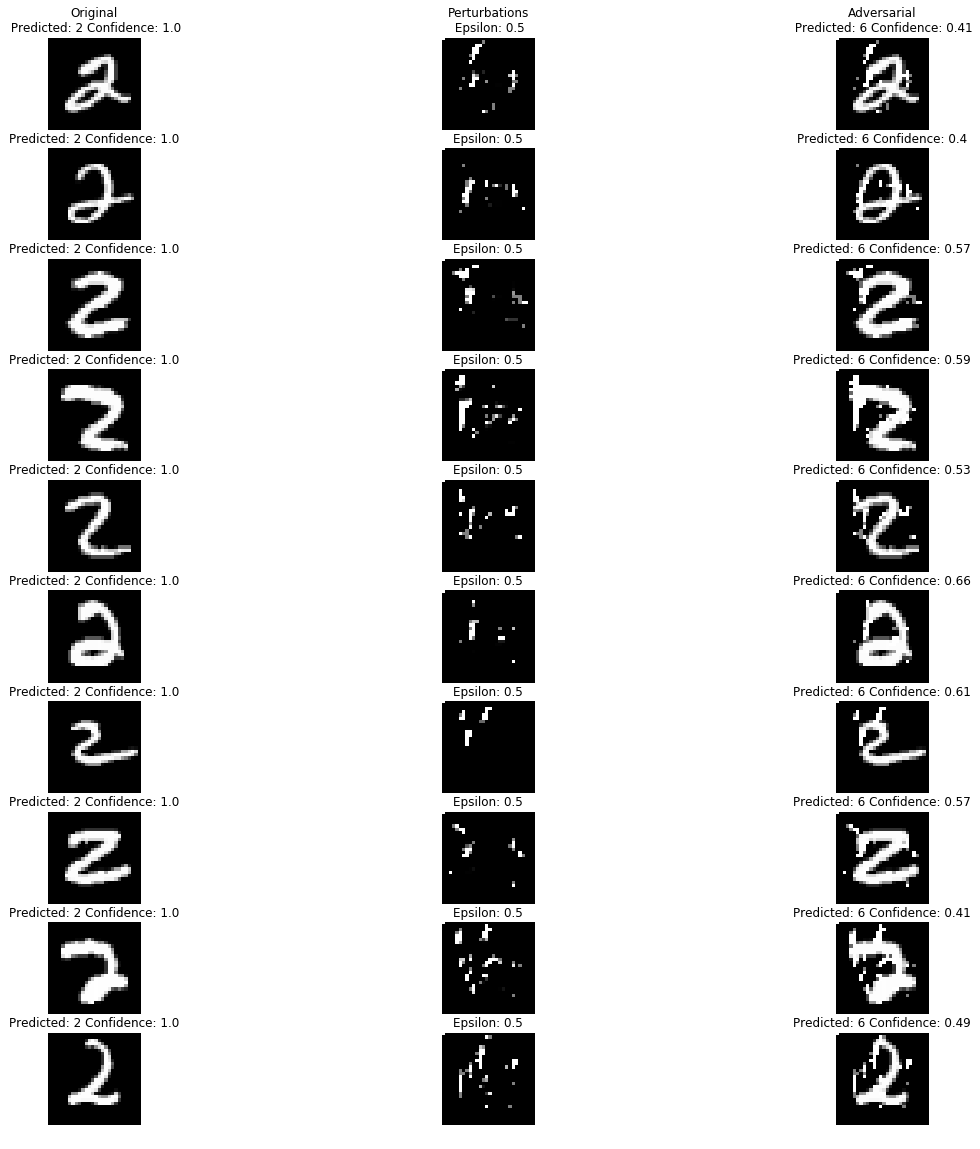 - It is apparent that searching for successful one pixel perturbation is a difficult task for MNIST. This is because MNIST images are grayscale two dimensional images whose space where adversarial perturbations can be found is small in comparision to 3D RGB input space of CIFAR-10 and ImageNet. Because of the exponential increase in input space, the probability of finding adversarial perturbation by search heuristics like evolutionary algorithm increases significantly. Even though finding one pixel perturbation failed, 5 pixel search was successful, suggesting larger search space indeed makes it easier to find adversarial examples.