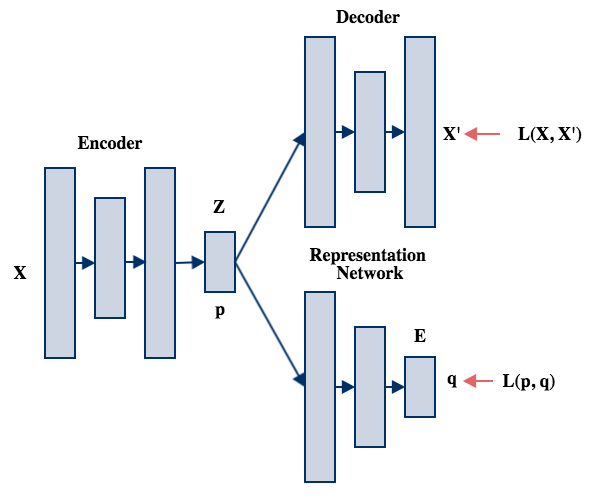 The Representation Network is trained by cross entropy of p and q, which has the effect of minimizing the entropy of distribution p as well.